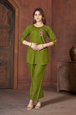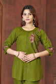 Olive Green Cotton Co-Ord Set for Women – Embroidered Kurta with Straight Pants