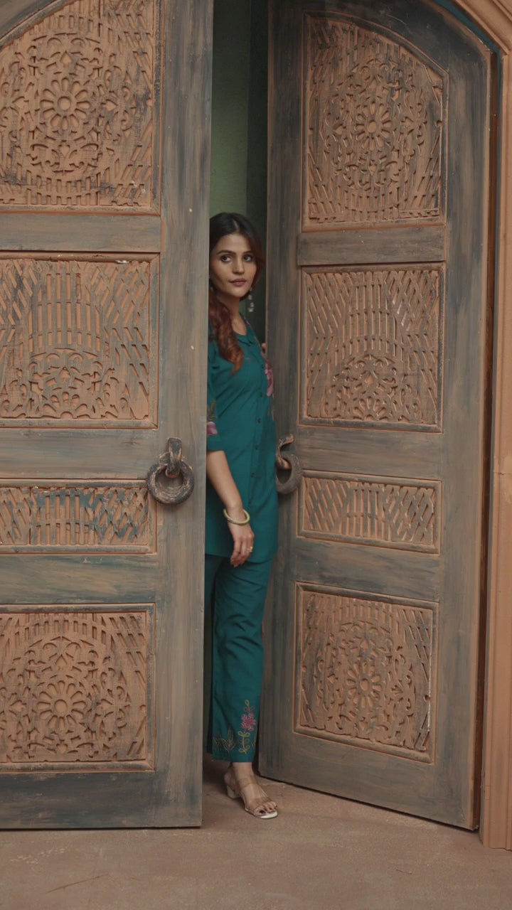 Upgrade your ethnic wardrobe with this teal green embroidered cotton co-ord set for women. Designed with a button-down kurta featuring floral embroidery and matching straight pants with delicate detailing, this outfit is a blend of elegance and comfort.